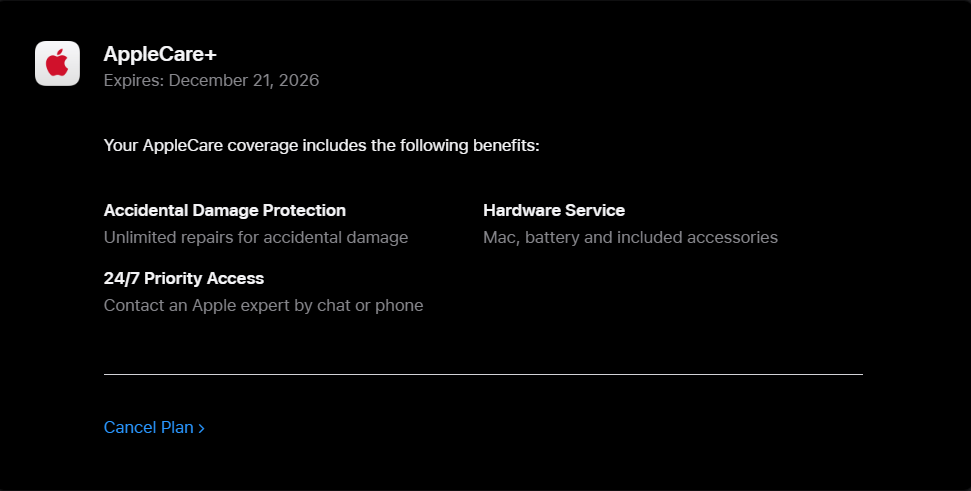 This MacBook Pro comes with AppleCare+ coverage valid through December 21, 2026, providing: